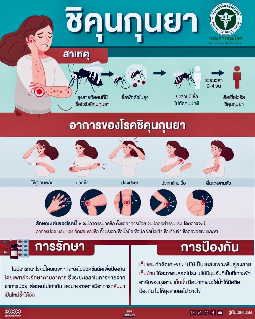 เนื่องจากสถานการณ์ฝนตกชุกอย่างต่อเนื่อง และครอบคลุมหลายพื้นที่นะคะ จึงส่งผลให้เกิดสภาพอากาศที่ชื้นแฉะ และมีแอ่งน้ำท่วมขังหลายจุด ส่งผลให้ยุงลายซึ่งเป็นพาหะนำโรค สามารถขยายพันธุ์ได้มากขึ้นในหลายพื้นที่นะคะ ปัจจุบันพบว่า มีการแพร่ระบาดของ “โรคไข้ปวดข้อยุงลาย” หรือ “ชิคุนกุนยา” (Chikungunya virus disease) ในพื้นที่ 5 จังหวัด ได้แก่ จ.เชียงใหม่ บึงกาฬ เลย หนองคาย และลำพูน นั่นเองค่ะ