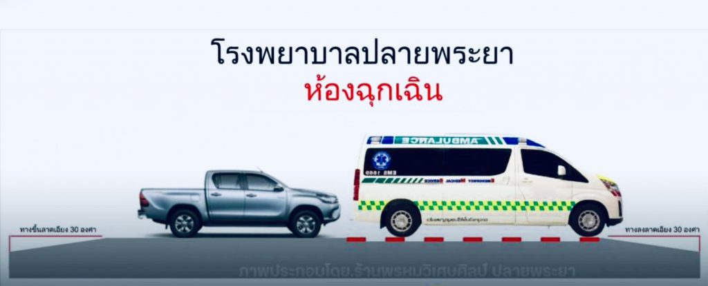 จากภาพ หากรถโรงพยาบาลเดินหน้าไป จะทำให้ช่วงท้ายของรถสูงขึ้น เนื่องจากเป็นทางลาดชันลงไป ซึ่งยากต่อการนำเปลคนไข้ขึ้นรถ เพราะระดับองศาจะไม่ลงล็อกที่ทางโรงพยาบาลออกแบบระดับระหว่างเปลกับล๊อกภายในรถไว้แล้วนั่นเองค่ะ จะเห็นได้ว่า ถ้าลองมีสติให้มากขึ้น ลองคิดดูกันค่ะว่า อันใหนง่ายกว่า ระหว่างกะบะถอยหลัง เพื่อให้เปลคนไข้ขึ้นท้ายรถได้เพื่ออีกหนึ่งชีวิตที่ยังพอมีโอกาสได้มีชีวิตรอดนะคะ