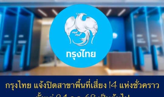 กรุงไทย แจ้งปิดสาขาพื้นที่เสี่ยง 14 แห่งชั่วคราว ตั้งแต่ 24 ก.ค. 68 เป็นต้นไป