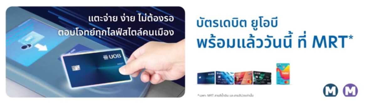 สำหรับธนาคารยูโอบี เป็นธนาคารที่ 2 ที่เปิดให้บัตรเดบิต สามารถแตะเข้า-ออกระบบรถไฟฟ้า MRT ได้ โดยรองรับทุกหน้าบัตรที่สามารถแตะจ่ายได้ (มีสัญลักษณ์คล้าย Wi-Fi บนหน้าบัตรหรือหลังบัตร) รวมถึงบัตรเดบิต TMRW รวมถึงรองรับการลงทะเบียนเข้าร่วมมาตรการ “รถไฟฟ้า 20 บาท” ที่จะเริ่มขึ้นตั้งแต่วันที่ 25 สิงหาคม 2568
