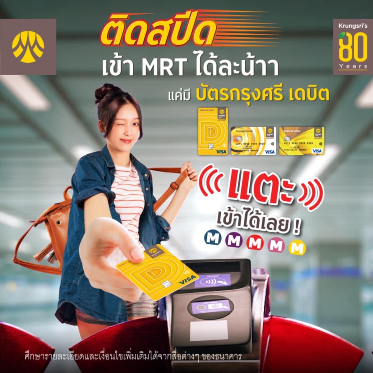 ธนาคารกรุงศรีอยุธยา เป็นธนาคารที่ 3 ที่สามารถใช้บัตรเดบิตแตะเข้า-ออกระบบรถไฟฟ้า MRT ได้อย่างเป็นทางการ ตั้งแต่เมื่อวันที่ 1 สิงหาคม 2568 เป็นต้นมา รวมถึงบัตร Krungsri Boarding Card รองรับการใช้งานแตะเข้า-ออกระบบรถไฟฟ้าได้ก่อนหน้าแล้ว โดยบัตรเดบิตทุกประเภทบัตร / ทุกหน้าบัตร ที่มีสัญลักษณ์ Contactless สามารถใช้งานแตะเข้า-ออกระบบรถไฟฟ้า MRT ได้ ยกเว้นบัตร Krungsri NRBA / Krungsri FCD