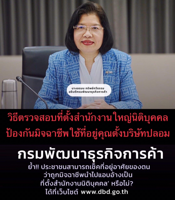 นางอรมน ทรัพย์ทวีธรรม อธิบดีกรมพัฒนาธุรกิจการค้า เปิดเผยว่า มีประชาชนร้องเรียนว่าถูกนำที่อยู่ไปใช้เป็นที่ตั้งนิติบุคคลโดยไม่ได้ยินยอม เพื่อป้องกันปัญหานี้ กรมฯ ได้พัฒนาระบบตรวจสอบที่อยู่ผ่านเว็บไซต์ www.dbd.go.th ตั้งแต่ 10 กุมภาพันธ์ 2568 ที่ผ่านมาจนถึงตอนนี้ เพื่อให้ทุกคนสามารถเช็กได้ว่าที่อยู่ของตนถูกสวมสิทธิ์หรือไม่
