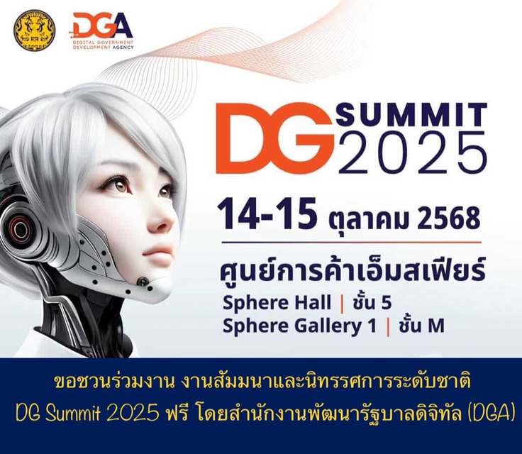 โดยสำนักงานพัฒนารัฐบาลดิจิทัล (DGA) ขอชวนร่วมงาน DG Summit 2025 ฟรี โดยสำนักงานพัฒนารัฐบาลดิจิทัล (DGA) งานสัมมนาและนิทรรศการระดับชาติ เพื่อคนไทยทุกคนเลยนะคะ งานจะจัดขึ้นในวันที่ 14-15 ตุลาคม 2568 นี้ ที่ Sphere Hall ชั้น 5 และ Sphere Gallery 1 ชั้น M ศูนย์การค้า Emsphere นะคะ