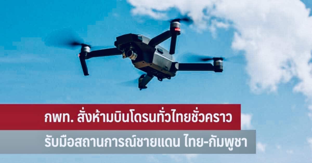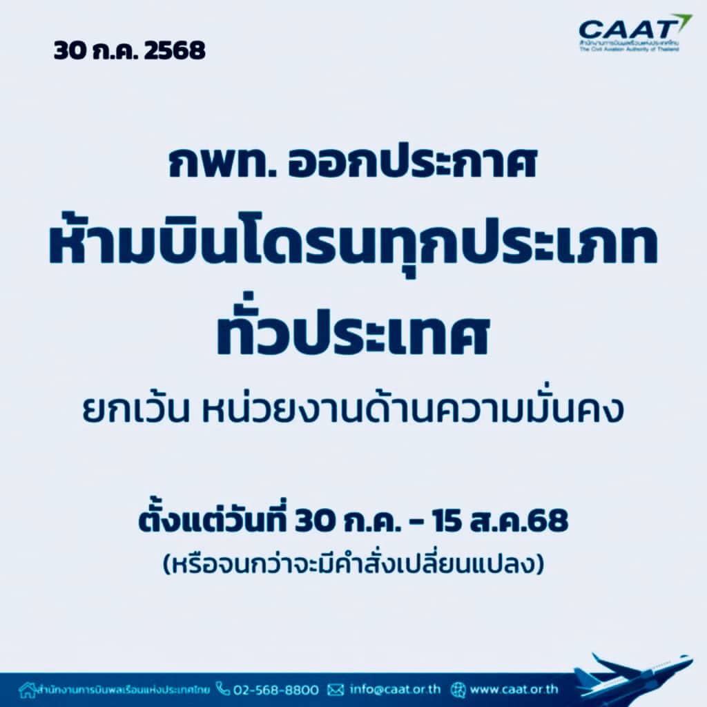 ประกาศห้ามบินโดรนทุกชนิดทั่วประเทศถึง 15 สิงหาคม ยกเว้นหน่วยงานความมั่นคง สำนักงานการบินพลเรือนแห่งประเทศไทย หรือ กพท. ออกประกาศด่วน ห้ามทำการบินหรือปล่อยอากาศยานที่ไม่มีนักบิน (โดรน) ทุกประเภทในพื้นที่ทั่วประเทศ ให้มีผลตั้งแต่ 30 กรกฎาคม 2568 หรือวันนี้ ไปจนถึงวันที่ 15 สิงหาคม 2568 หรือจนกว่าจะมีคำสั่งเปลี่ยนแปลง