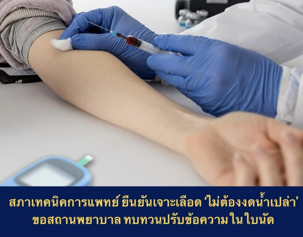 สภาเทคนิคการแพทย์ ยืนยันเจาะเลือด ‘ไม่ต้องงดน้ำเปล่า’ ขอสถานพยาบาล ทบทวนปรับข้อความในใบนัด