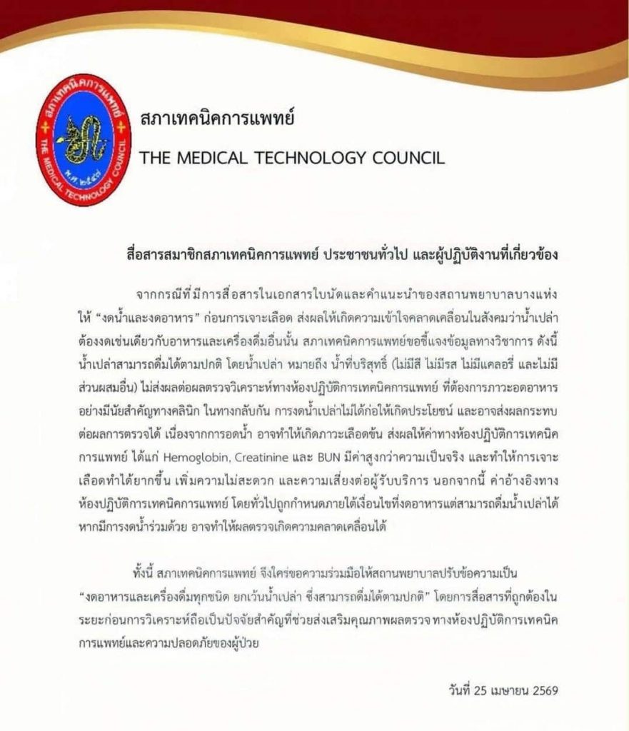 ทั้งนี้ สภาเทคนิคการแพทย์ จึงไคร่ขอความร่วมมือให้สถานพยาบาลปรับข้อความเป็น “งดอาหารและเครื่องดื่มทุกชนิด ยกเว้นน้ำเปล่า ซึ่งสามารถดื่มได้ตามปกติ” โดยการสื่อสารที่ถูกต้องในระยะก่อนการวิเคราะห์ถือเป็นปัจจัยสำคัญที่ช่วยส่งเสริมคุณภาพผลตรวจ ทางห้องปฏิบัติการเทคนิค