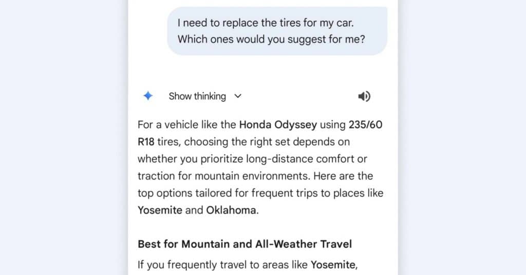 เช่น หากเราสอบถามว่ายางรถยนต์ที่ใช้อยู่ขนาดเท่าไหร่ Gemini จะสืบค้นข้อมูลจากรูปภาพใน Google Photos ของคุณ เพื่อนำมาตอบคำถามดังกล่าว พร้อมให้คำแนะนำสิ่งที่เหมาะสมกับผู้ใช้คนนั้น ๆ โดยที่ผู้ใช้ไม่จำเป็นต้องเปิดดูข้อมูลเองให้เสียเวลา