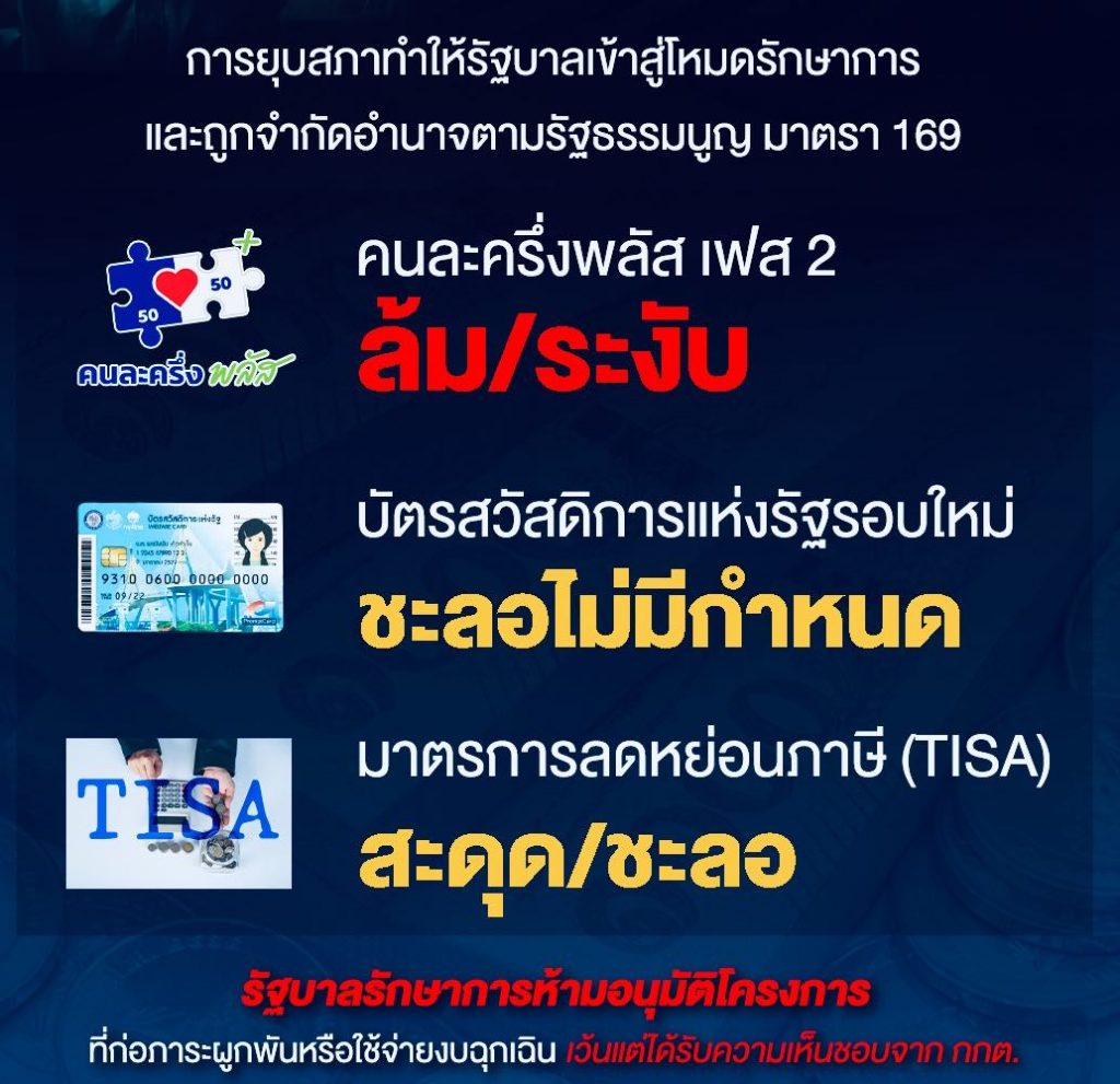 บัตรสวัสดิการแห่งรัฐ–TISA ชะงักยกชุด แหล่งข่าวจากกระทรวงการคลังเปิดเผยว่า การยุบสภามีผลให้โครงการใหญ่หลายรายการต้องหยุดชั่วคราว เช่น