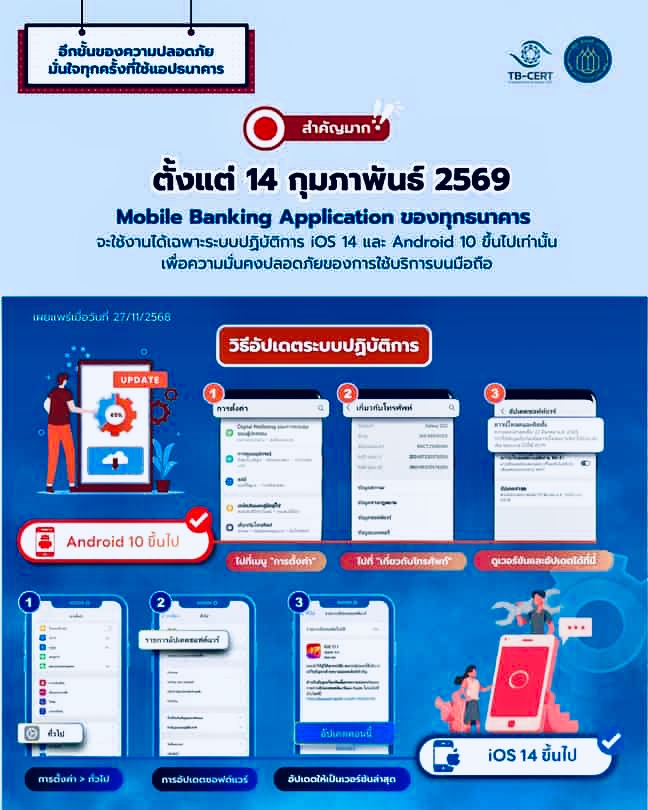 เกณฑ์การรองรับใหม่ สำหรับแอปธนาคารในไทย เริ่ม 14 กุมภาพันธ์ 2569 เพื่อให้สามารถใช้งานแอปฯ ธนาคารได้อย่างต่อเนื่อง อุปกรณ์ของผู้ใช้จะต้องมีระบบปฏิบัติการขั้นต่ำ ดังนี้