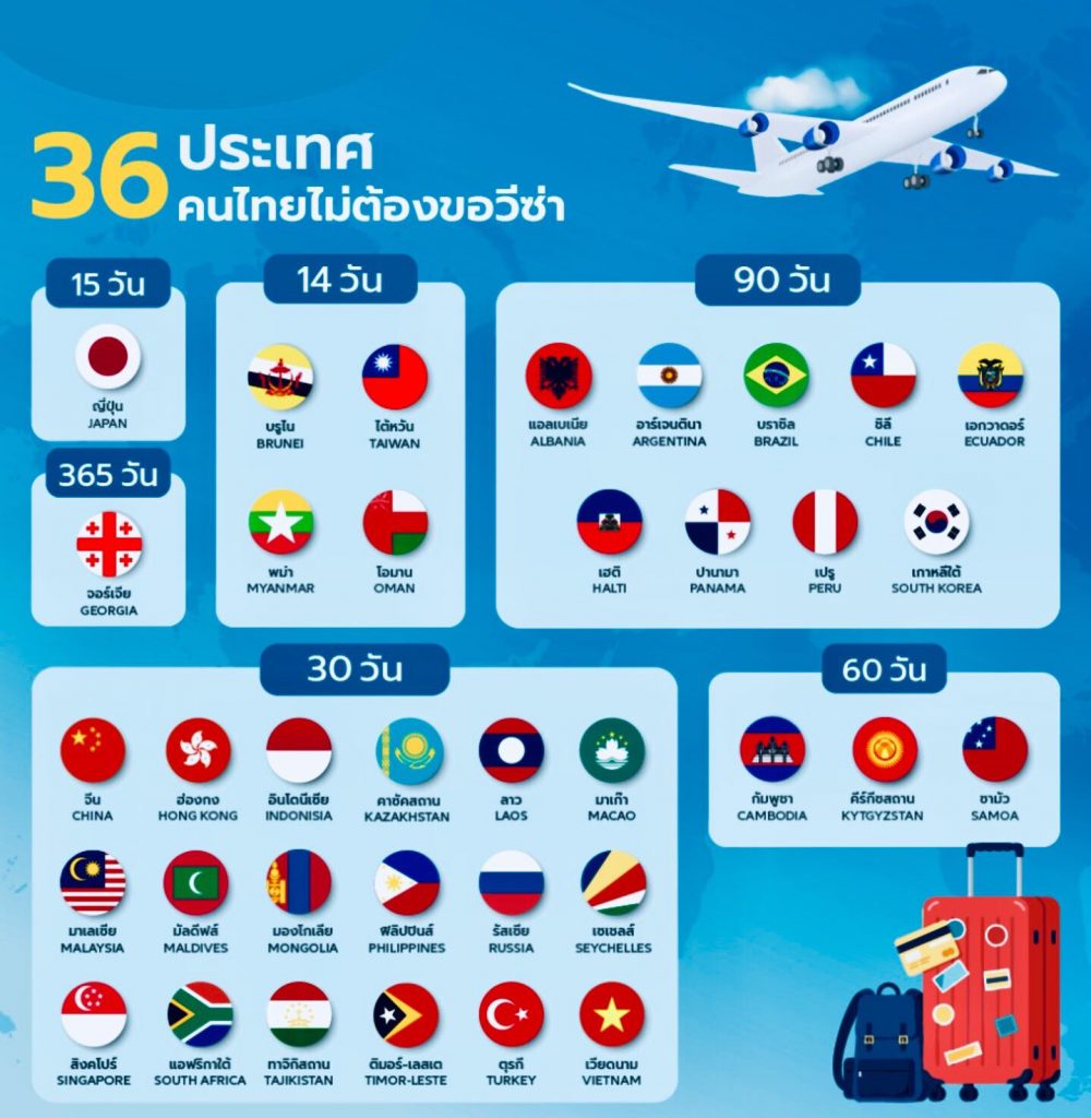 รายชื่อ 36 ประเทศ/ดินแดน ที่คนไทยไม่ต้องขอวีซ่า (สำหรับผู้ถือหนังสือเดินทางธรรมดา) ข้อมูล ณ วันที่ 12 พฤศจิกายน 2568 ได้รวบรวมประเทศที่คนไทยสามารถเดินทางไปได้โดยไม่ต้องขอรับการตรวจลงตรา โดยจะมีระยะเวลาพำนักที่แตกต่างกันไปตามข้อกำหนดของแต่ละประเทศ ดังนี้