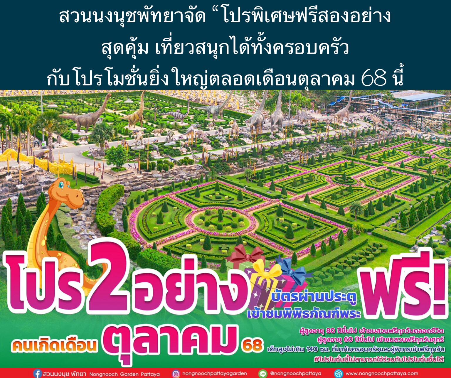 สวนนงนุชพัทยาโดยนายกัมพล ตันสัจจาประธานสวนนงนุชพัทยา จัดโปรโมชั่นสุดพิเศษให้กับทุกท่านที่เกิดในเดือนตุลาคม เพียงแสดงบัตรประชาชนหรือหลักฐานยืนยันตัวตน รับสิทธิ เข้าชมสวนนงนุชฟรี พร้อม เข้าชมพิพิธภัณฑ์พระพุทธคุณฟรีได้โดยไม่เสียค่าใช้จ่าย ตั้งแต่วันที่ 1 ถึง 31 ตุลาคมนี้เท่านั้นนะคะ