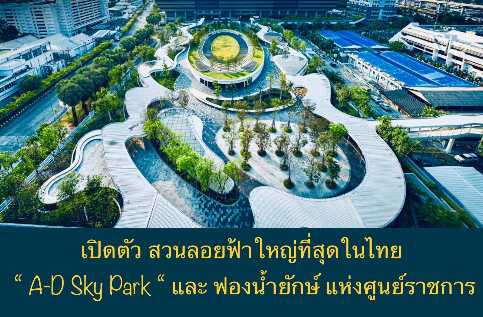 ศูนย์ราชการเฉลิมพระเกียรติฯ เปิดตัว ‘A-D Sky Park’ สวนลอยฟ้าที่ใหญ่ที่สุดในประเทศไทย ซึ่งเป็นการปรับปรุงพื้นที่ดาดฟ้าอาคารจอดรถ A และ D ให้เป็นลานกิจกรรมและสวนสาธารณะ ตัวอาคารจอดรถได้รับการพัฒนาให้เป็น ‘ฟองน้ำยักษ์’ (Sponge Parking) เพื่อทำหน้าที่กักเก็บและนำน้ำฝนกลับมาใช้ใหม่ ลดการปล่อยน้ำทิ้งสู่ภายนอก