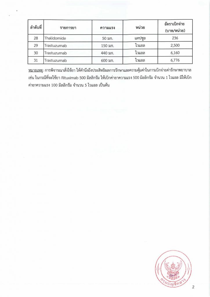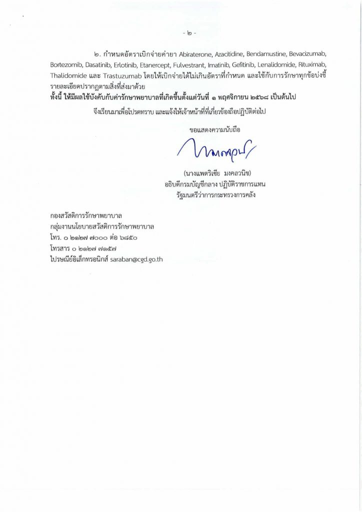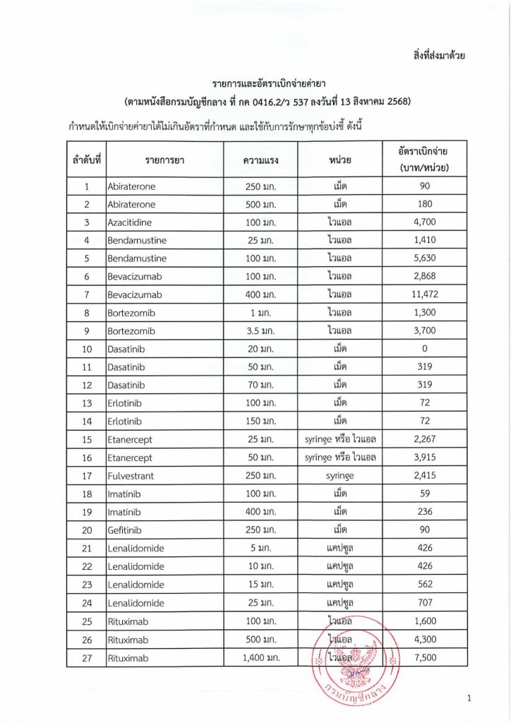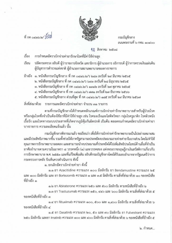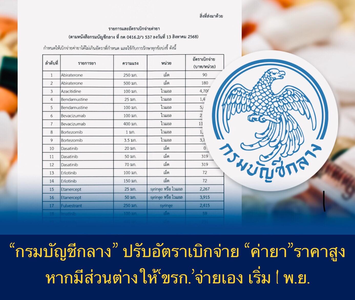 Abiraterone, Azacitidine, Bendamustine, Bevacizumab, Bortezomib, Dasatinib, Erlotinib, Etanercept, Fulvestrant, Imatinib, Gefitinib, Lenalidomide, Rituximab, Thalidomide และ Trastuzumab โดยให้เบิกจ่ายได้ไม่เกินอัตราที่กำหนด และใช้กับการรักษาทุกข้อบ่งชี้รายละเอียดปรากฏตามสิ่งที่ส่งมาด้วย ทั้งนี้ ให้มีผลใช้บังคับกับค่ารักษาพยาบาลที่เกิดขึ้นตั้งแต่วันที่ 1 พ.ย.2568 จึงเรียนมาเพื่อโปรดทราบ และแจ้งให้เจ้าหน้าที่ที่เกี่ยวข้องถือปฏิบัติต่อไป หนังสือเวียนที่ออกไปดังกล่าว ไม่ได้กำหนดให้มีการร่วมจ่าย หรือ copayment แต่อย่างใด แต่เป็นการปรับเรื่องการใช้ยาให้เหมาะสม ตามอัตราที่กรมบัญชีกลางกำหนด ให้เป็นไปตามเงื่อนไข ข้อบ่งชี้ และเพดานที่กำหนด โดยอ้างอิงจากข้อมูลการใช้ยาจริงของสถานพยาบาล และฐานข้อมูลการเบิกจ่ายค่ารักษาพยาบาล (Medical Benefit Database) ของกรมบัญชีกลาง และราคาจัดซื้อของสำนักงานหลักประกันสุขภาพแห่งชาติ (สปสช.) เพื่อให้มั่นใจว่า อัตราใหม่สอดคล้องกับราคาที่จัดซื้อจริง ซึ่งช่วยเพิ่มประสิทธิภาพการบริหารงบประมาณด้านยาอย่างคุ้มค่า เป็นการกำหนดเงื่อนไขการจ่ายตามปกติ ที่กรมบัญชีกลางทำมาอย่างต่อเนื่อง เช่นเดียวกับกรณีค่าห้อง ค่าอวัยวะเทียม และค่าตรวจวินิจฉัย เป็นต้น