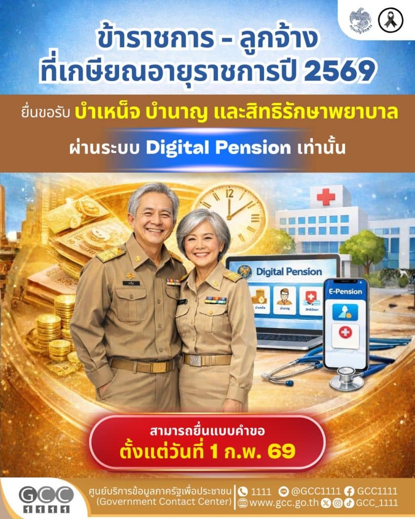 เปิดลงทะเบียน “กรมบัญชีกลาง” แจ้ง “ข้าราชการ – ลูกจ้าง” ที่จะเกษียณปี 69 ยื่นคำขอรับ “บำเหน็จ-บำนาญ-สิทธิรักษาพยาบาลต่อเนื่อง” ผ่านระบบ Digital Pension เท่านั้น เริ่มยื่นแบบคำขอได้ตั้งแต่ 1 ก.พ. 69
