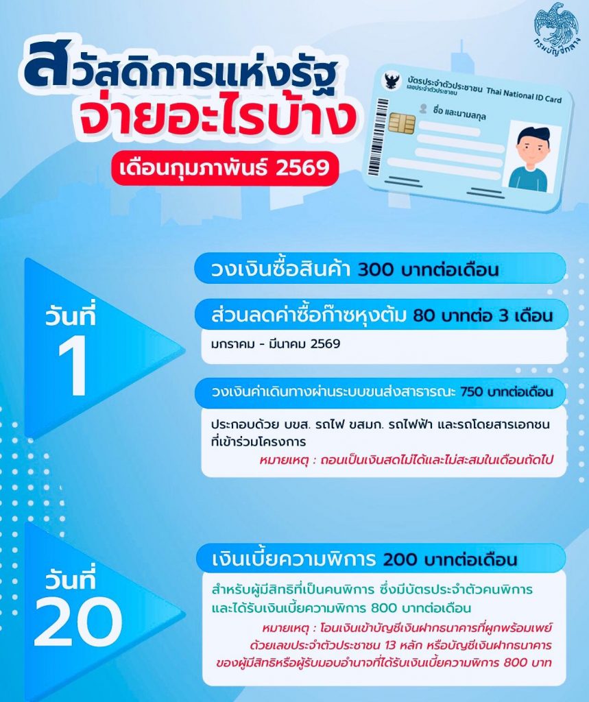 นายธนะโชค รุ่งธิปานนท์ รองอธิบดีกรมบัญชีกลาง ในฐานะโฆษกกรมบัญชีกลาง เปิดเผยว่า “โครงการลงทะเบียนเพื่อสวัสดิการแห่งรัฐ ปี 2565” ผู้มีสิทธิสามารถใช้สิทธิผ่านบัตรประจำตัวประชาชนแบบสมาร์ทการ์ด ซึ่งในเดือนกุมภาพันธ์ 2569 จะได้รับสิทธิ ดังนี้