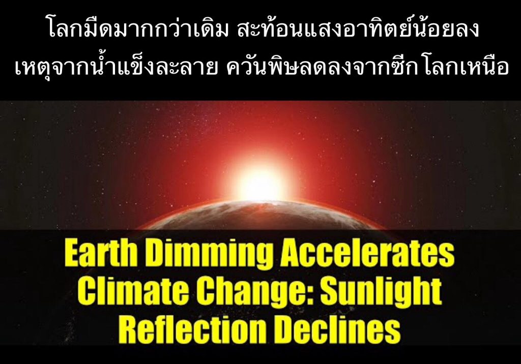 โลกกำลังมืดลงเนื่องจากสะท้อนแสงอาทิตย์กลับสู่อวกาศได้น้อยลง โดยเฉพาะซีกโลกเหนือที่มืดลงเร็วกว่าซีกโลกใต้นะคะ โดยสาเหตุหลักก็คือการละลายของน้ำแข็งและหิมะ ซึ่งเป็นพื้นผิวสีสว่างที่ช่วยสะท้อนแสง ถูกแทนที่ด้วยพื้นดิน และมหาสมุทรที่ดูดซับความร้อน พร้อมด้วยการลดลงของมลพิษทางอากาศ และควันพิษในซีกโลกเหนือ จากมาตรการควบคุมคุณภาพอากาศ ทำให้มีอนุภาคที่เคยช่วยสะท้อนแสงในบรรยากาศน้อยลงนั่นเองค่ะ “โลก” มืดลงมากกว่าเดิม เนื่องจากสะท้อนแสงอาทิตย์กลับเข้าสู่อวกาศน้อยลงกว่าแต่ก่อน ส่งผลให้เกิดการเปลี่ยนแปลงสภาพภูมิอากาศ